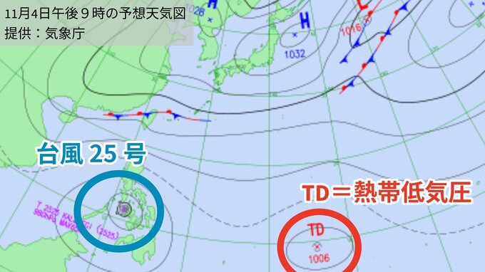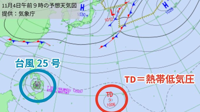 気象庁によりますと、あす(4日)午前9時の予想天気図では、カロリン諸島付近に“台風のたまご”にあたる「熱帯低気圧」が発生する見込みだということです【画像①】。
