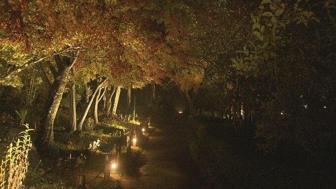 白河市の南湖公園「翠楽苑」では10月31日に紅葉のライトアップが始まりました。敷地内には、90灯のライトに照らされたモミジやイチョウが色鮮やかに浮かびあがっています。初日はあいにくの雨でしたが、紅葉のライトアップをひと目見ようと見物客が訪れ、その美しさに見入っていました。