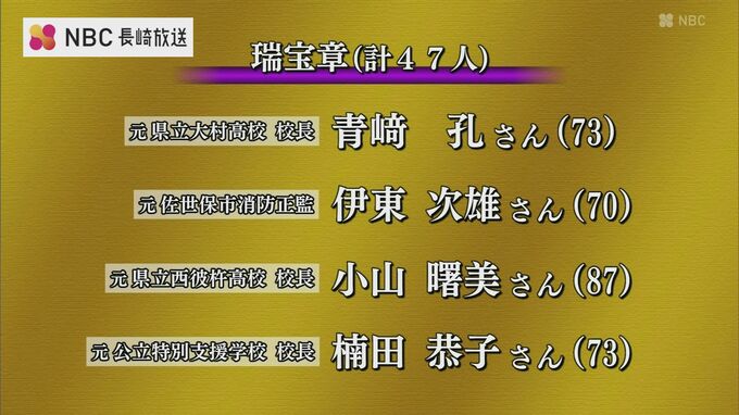 また公務や教育の分野に長年従事した人を称える瑞宝章には、長崎県立大村高校の元校長で数理探究科を新設し科学技術の発展に寄与する人材育成に務めた青﨑孔さんなど47人が選ばれました。