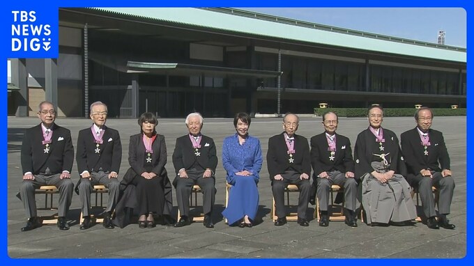 その後、8人は宮殿の東庭に移動。秋晴れの空の下、受章者らは勲章を胸につけて笑顔で記念撮影にのぞみました。