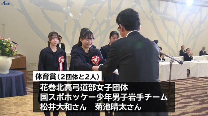 また、体育賞は2024年12月の全国高校選抜大会で優勝した花巻北高弓道部女子団体など2団体と2人に贈呈され、障害者スポーツを対象にした体育賞・希望と中学生に贈られる体育賞・未来に選出された1団体と2人にも記念の盾が贈られました。