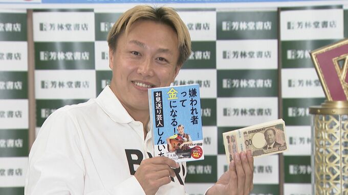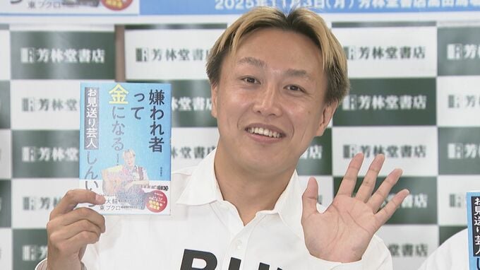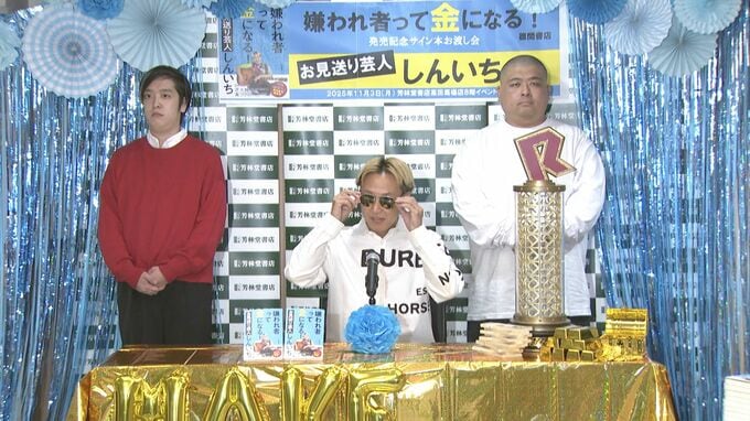 お見送り芸人しんいちさんが、初の著書『嫌われ者って金になる!』の発売を記念した取材会に登場しました。