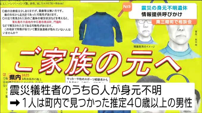南三陸町志津川のイベント会場で開かれた相談会には、警察官11人が参加し東日本大震災で犠牲となった身元がわからない遺体の似顔絵や発見場所を記したチラシを配って情報提供を呼びかけました。宮城県内では震災の犠牲者のうち6人の身元が未だに分かっておらず、そのうち1人は南三陸町内で見つかった推定40歳以上の男性だということです。