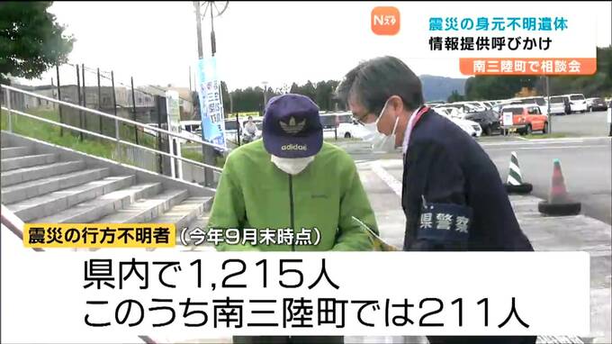 また、宮城県によりますと、今年9月末時点で、震災による県内の行方不明者は1215人に上り、このうち南三陸町では211人となっています。県警は今後も被災地でこうした相談会を開くことにしています。