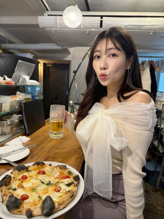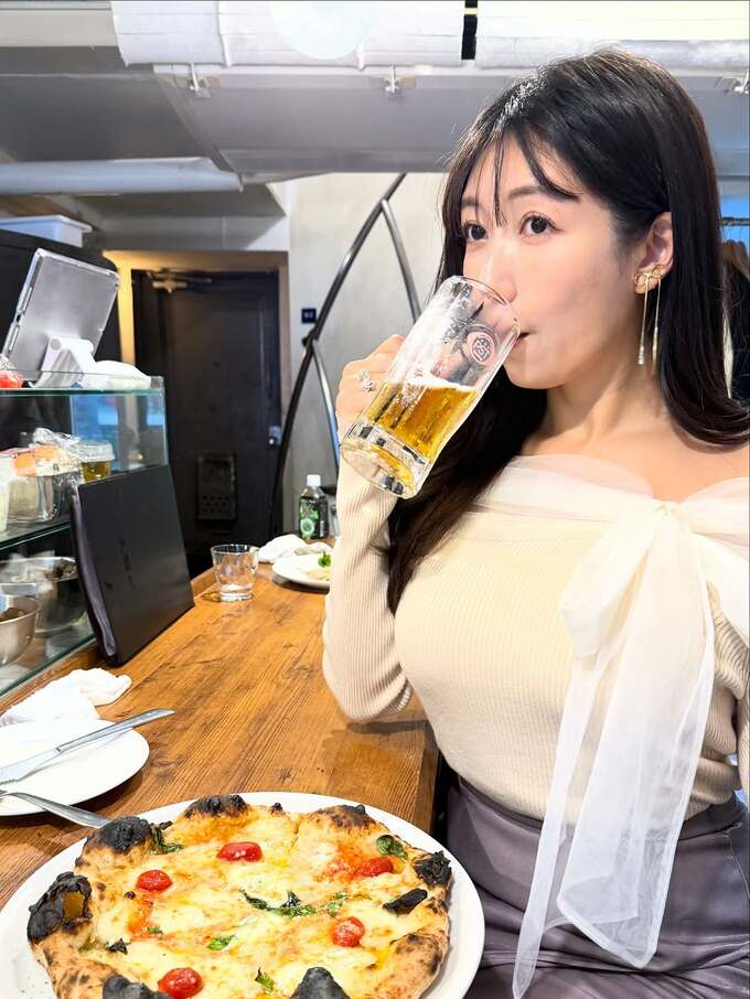 写真からは、木製カウンターとガラスケースが並ぶカジュアルな店内の雰囲気も伝わってきます。穂川さんはオフショルダーの白いトップスに大きなリボンをあしらったスタイルで、ピザとビールを楽しんでいる様子です。