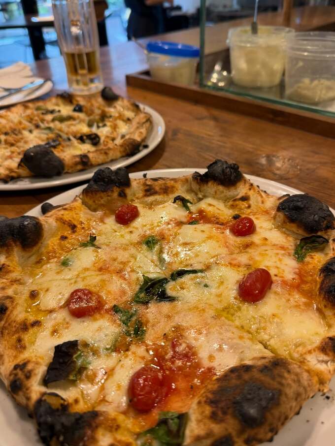 ピザはチーズがたっぷりと使われ、トマトとバジルが鮮やかな彩りを添えています。クラストには焼き目がついて香ばしさを感じさせる一枚です。