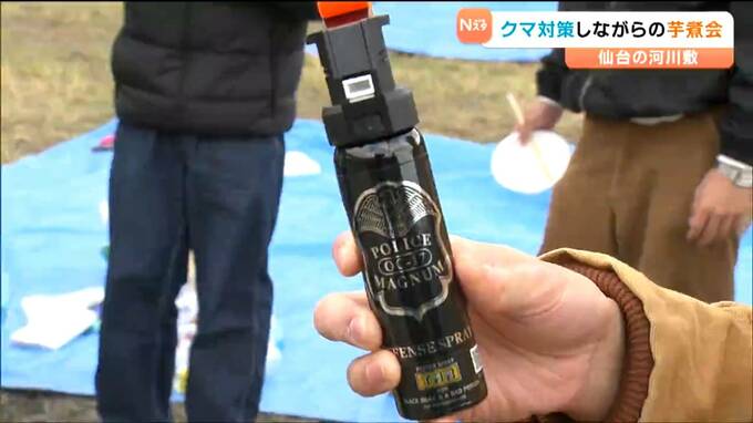 宮城県内でも目撃が相次ぐクマに備え、クマ撃退スプレーを用意して芋煮を味わっていました。