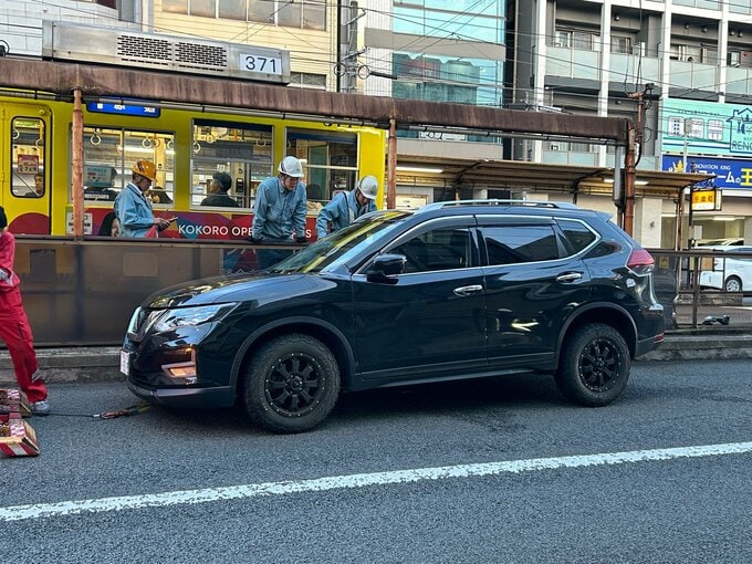 警察によりますと、車には3人が乗っていましたが、けがはなく、路面電車の運行への影響もないということです。