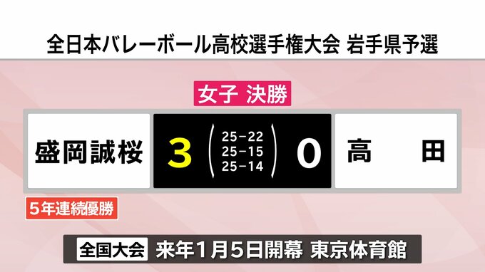 女子は盛岡誠桜と高田が対戦し、セットカウント3対0で盛岡誠桜が勝って5年連続の優勝です。