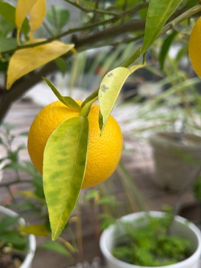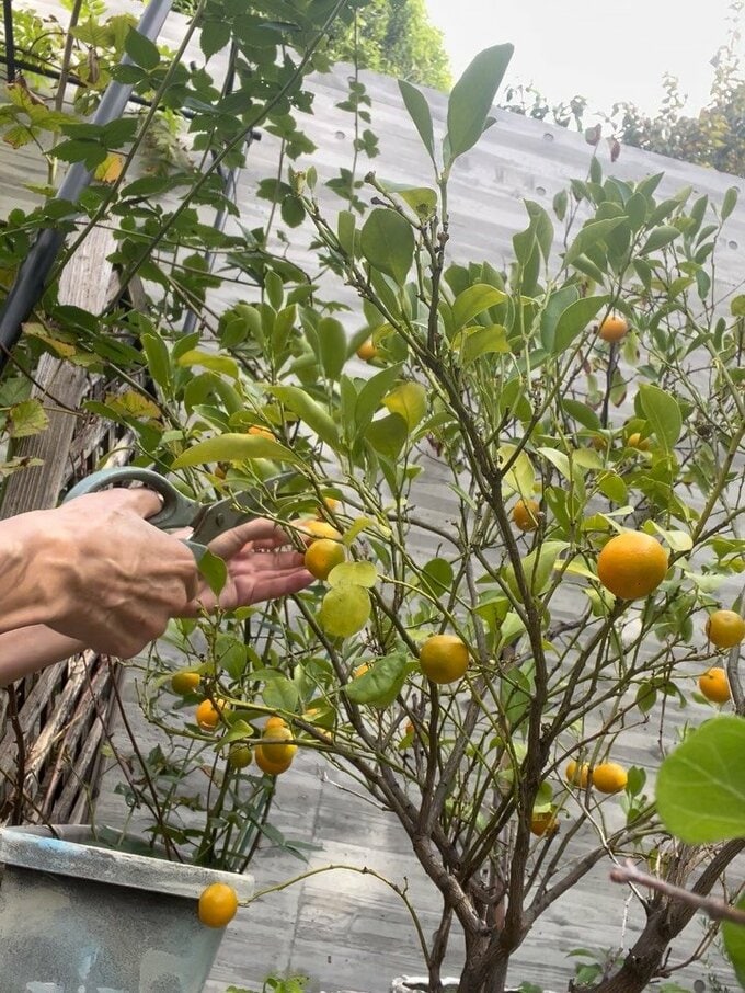 庭やベランダで育てている柑橘の木には、黄色く色づいた実が多数なっており、「カボス、もう黄カボス、黄色くなっちゃった。もう取ってしまう」と収穫の様子を伝えています。