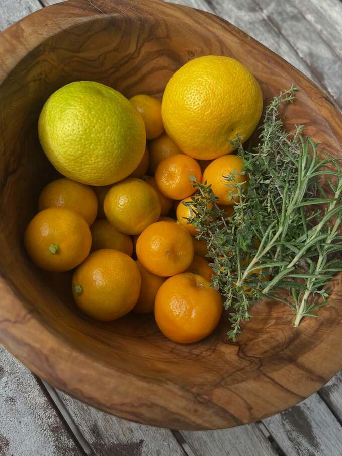 動画には、木製のボウルに盛られた鮮やかな黄色の柑橘類とローズマリーやタイムといったハーブも映されています。素朴で温かみのある木のボウルが、柑橘の鮮やかな黄色や橙色を引き立てています。