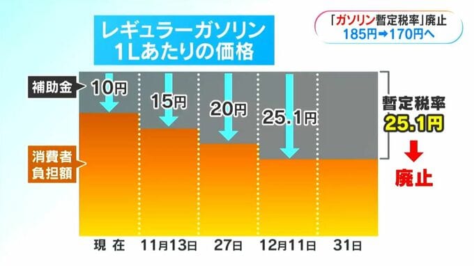 レギュラーガソリンの場合、現在、1リットルあたり10円の補助金を今月13日から2週間ごとに5円ずつ積み増し、12月11日に暫定税率分の25.1円と同じ額まで引き上げます。暫定税率自体は12月31日に廃止され、同時に補助金はなくなります。