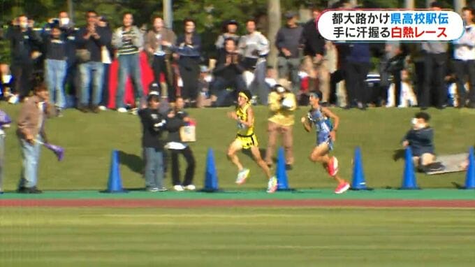粘り強く追う鹿児島城西。最終7区での差は16秒となり、勝負の行方は最後のトラックへ。