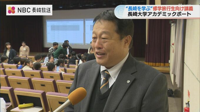 「長崎にはたくさんの修学旅行生が来られるから、その『修学』の部分をですね、ちょっとここで学んでいただいてですね、それでいて、長崎大学にも興味持ってもらえる人が増えるといいなというのが本音でございます。」