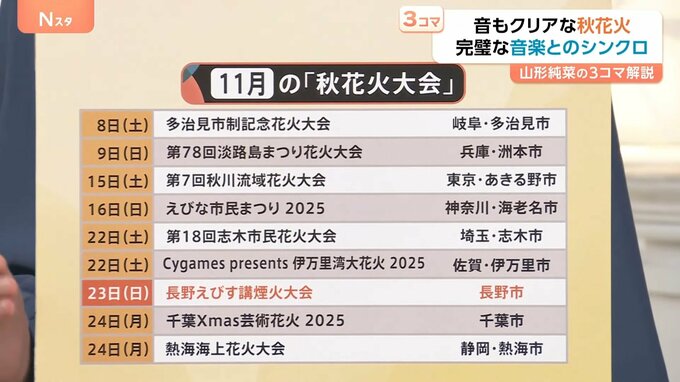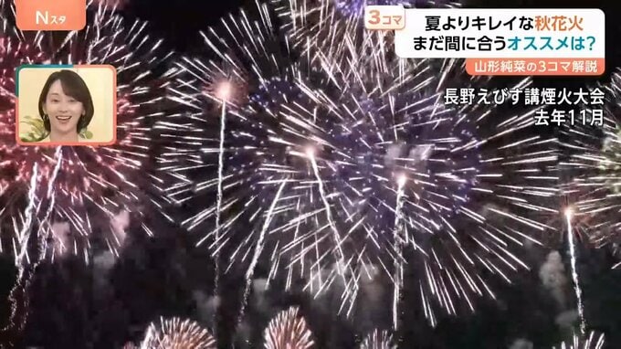 秋花火大会の中で、花火マニアの安斎幸裕さんのおすすめは、毎年11月23日に行われる「長野えびす講煙火大会」だそうです。