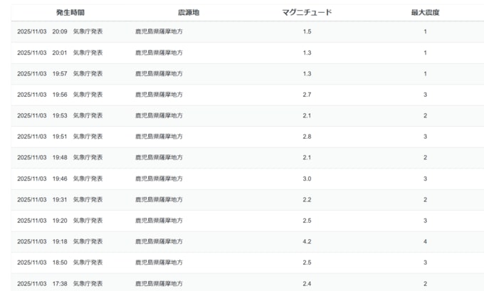 薩摩地方では、3日午後5時38分から地震が相次いでいて、午後8時10分までの間に震度1以上の地震が13回発生しています。