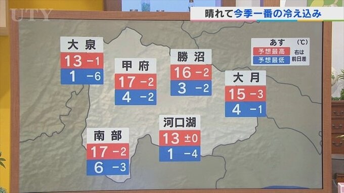 あすの予想気温を見ていきますと、けさと比べて北杜市大泉で6℃も低い1℃予想。北杜市大泉はけさは風が強かったので、あまり冷え込まなかったんですが
