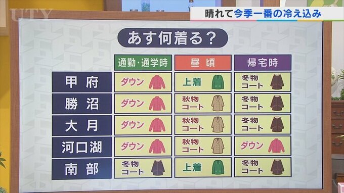 ただ晴れますからそこから気温が上がって甲府ではジャケット1枚で過ごせる陽気ですが、勝沼、大月、河口湖は秋物コートの出番。