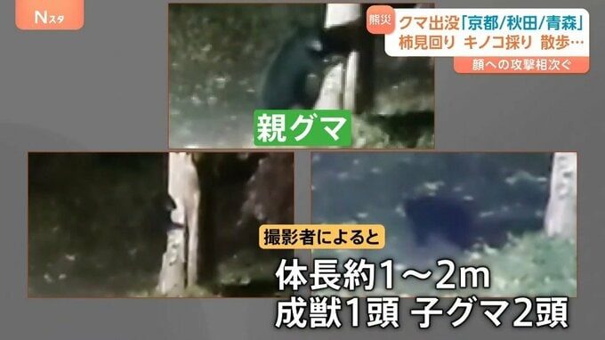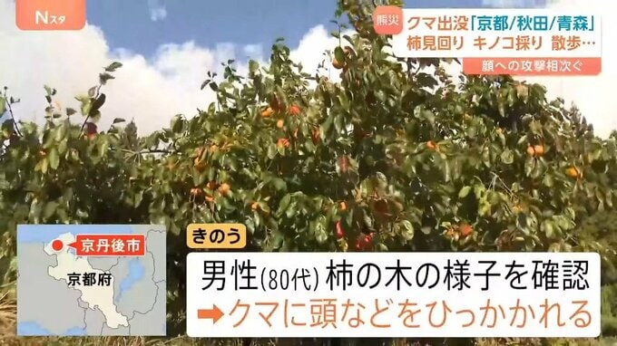 また、京都府京丹後市では2日、80代の男性が柿の木の様子を見に行ったところ、クマに頭や太ももを引っかかれたということです。