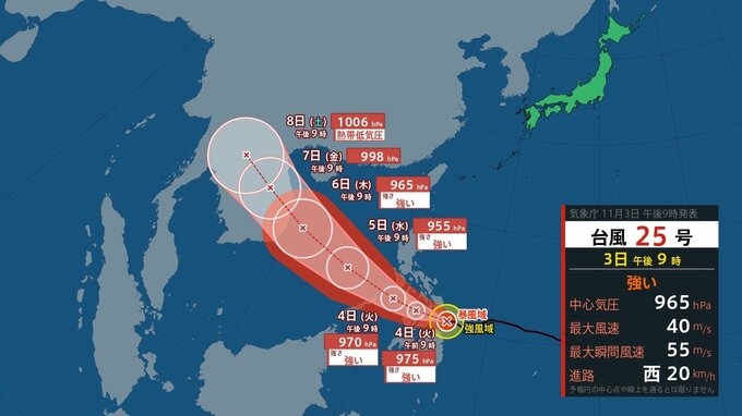 台風25号は、きょう(3日)午後9時にはフィリピンの東に強い勢力で、1時間に20キロの速さで西に進んでいます。中心気圧は965ヘクトパスカル、中心付近の最大風速は40メートル、最大瞬間風速は55メートルとなっています。