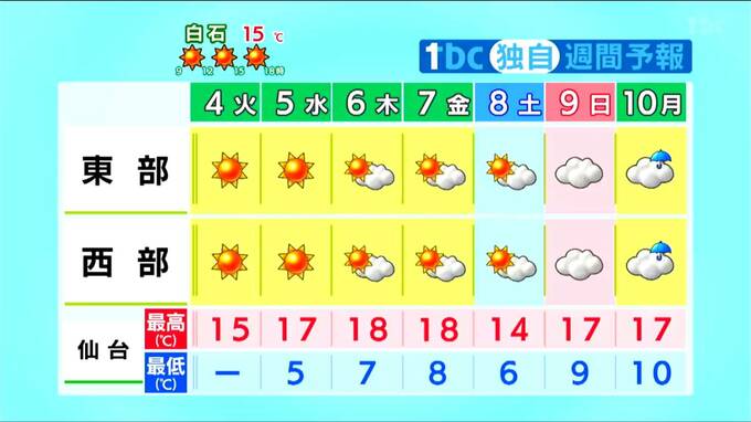 最高気温はきのう3日と同じくらいかやや低い予想ですが、日が沈むと放射冷却現象が強まり、急激に冷え込みます。あす5日の朝の最低気温は内陸や北部を中心に低く、平年より低い所が多くなる見込みです。仙台で5℃、古川で1℃、白石で2℃と予想されており、今朝と同じくらいか、さらに冷え込む所もあるでしょう。夜は暖かくして、体調管理に十分ご注意ください。