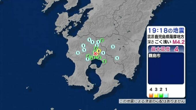 気象庁によりますと、3日午後7時18分ごろ、霧島市付近を震源地とする地震で、震度4を霧島市で観測しました。これまでに被害の情報は入っていません。