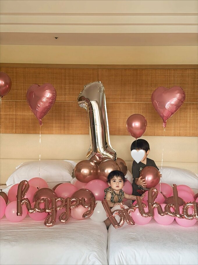 舟山さんは、「娘が1歳を迎えた記念に、家族で沖縄旅行へ 私たちからのプレゼントは、かけがえのない時間と想い出をつくる旅にしました」とコメントしています。投稿された写真には、ピンクやローズゴールドの風船に囲まれた誕生日の飾り付けや、「happy birthday」の文字、数字「1」の風船が映っています。