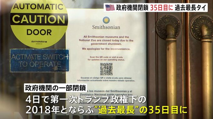 予算の失効によるアメリカの政府機関の一部閉鎖は、日本時間のもう間もなく午後2時に35日目をむかえ、“過去最長”だった2018年とならぶことになります。記者「閉館が続く国立博物館ですが、このあたり、最近では…