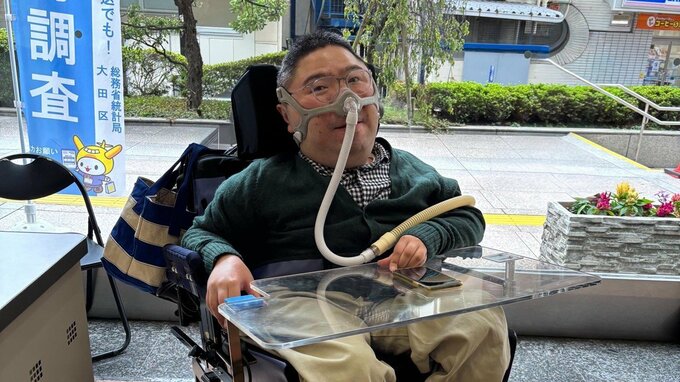 理事長の桑原章太さんは、車椅子生活で鼻に24時間人工呼吸器をつけていて、自由に動かせるのは指先程度です。