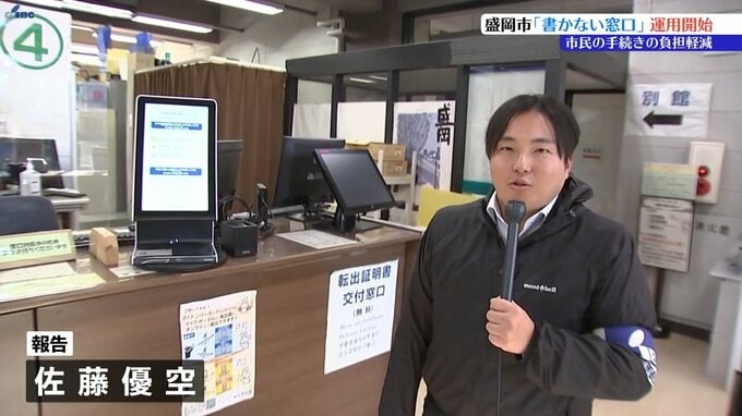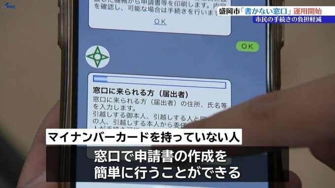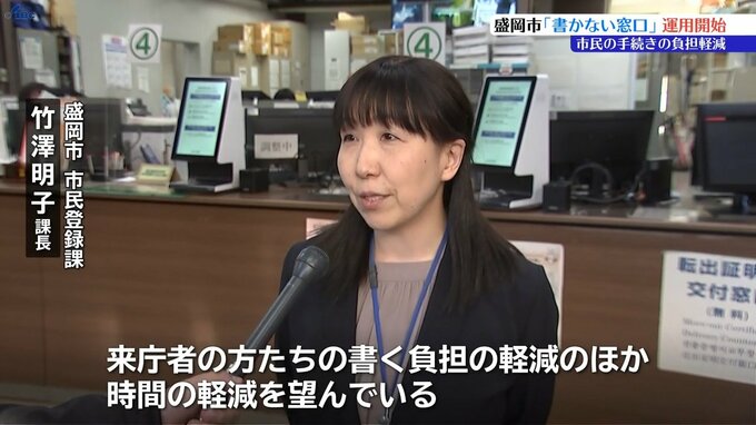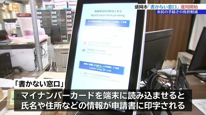 マイナンバーカードを使うことで転入・転居の届け出などの際の書類への記入を省略し、市民の行政手続きの負担を軽くするサービス「書かない窓口」の運用が4日、盛岡市役所で始まりました。