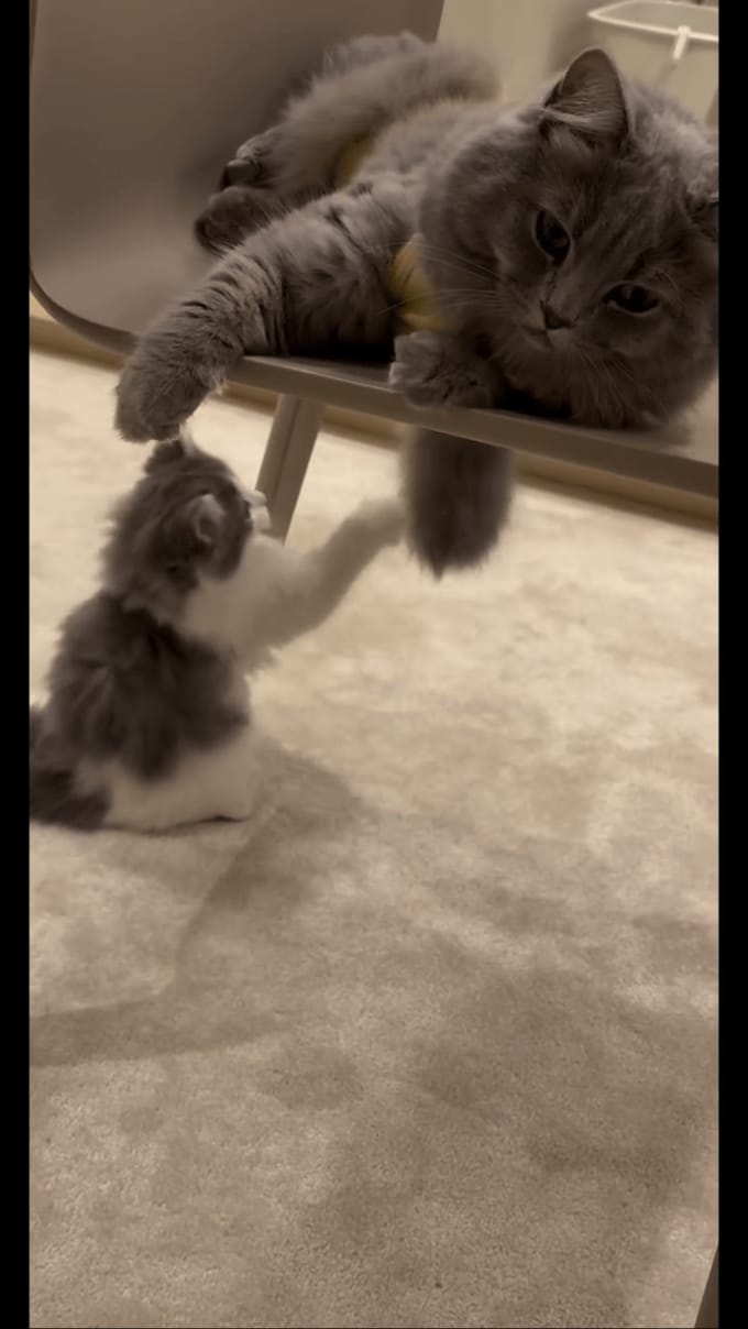 一旦は「おやすみニャさい」と書いた高橋さんですが、まだ遊ぶ気満々のラヴィを、テーブルの上で寝そべったミルリィが尻尾でじゃれつかせている動画を投稿。「優しいミルリィありがとう♡」「こう見えてもミルリィ明日で生後半年。」と、ミルリィが思いのほか早く成長している様子が見て取れます。