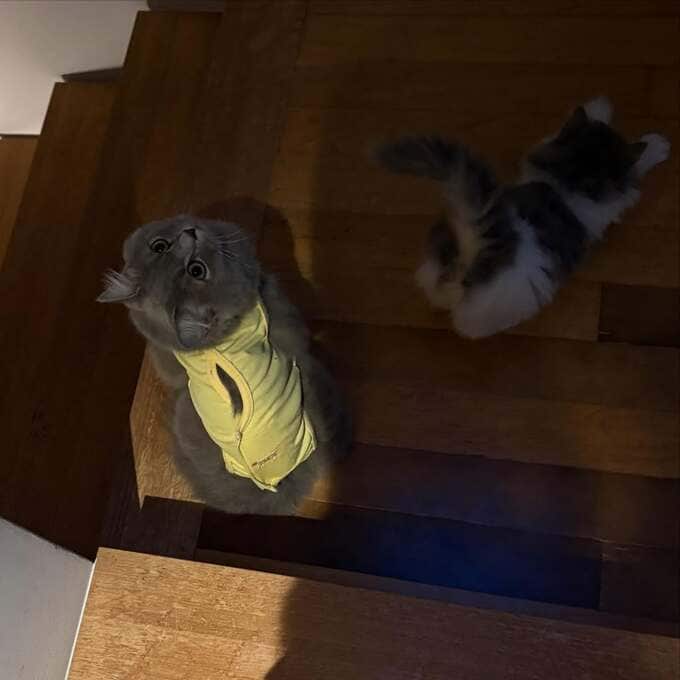 高橋さんは、階段のてっぺんでこちらを見上げているミルリィと、床面で伸びをしているラヴィの写真を投稿。「階段で繰り広げられる 秋の夜の大運動会」としていて、この階段を互いに追い駆けあいながら上り下りしていた様子が想像できます。