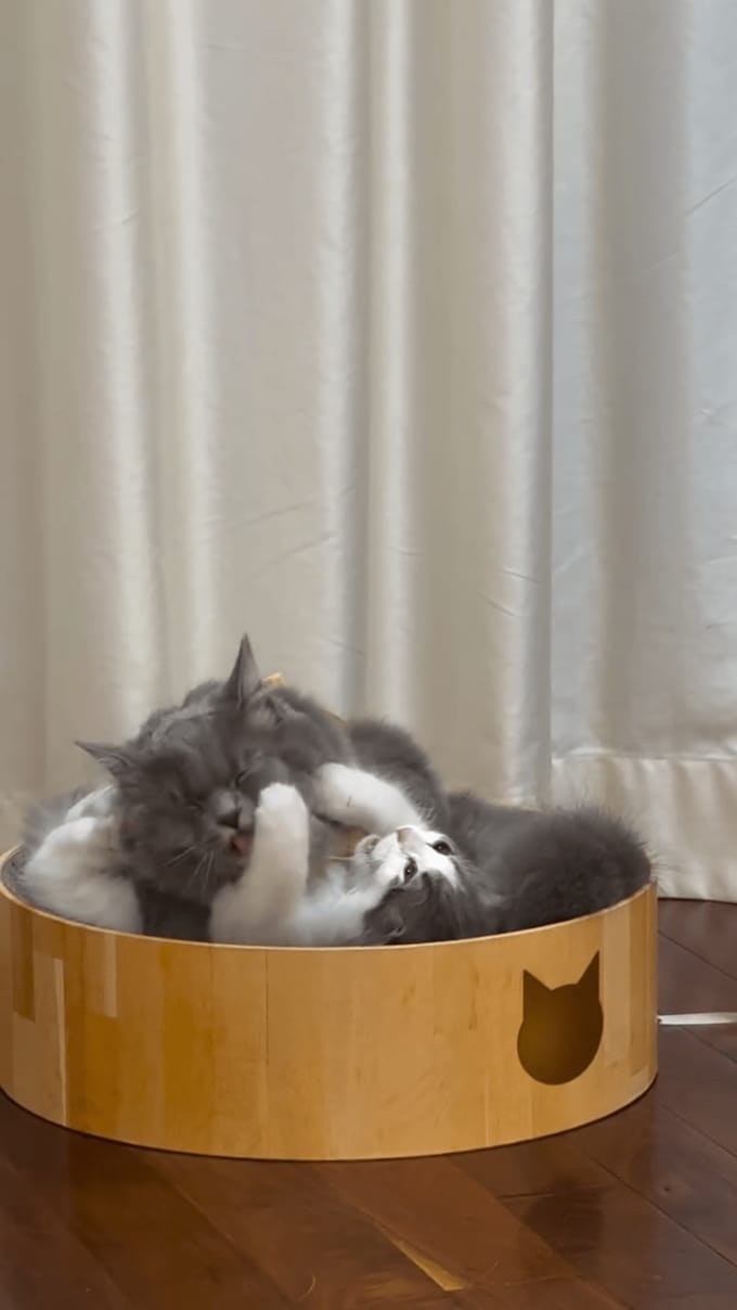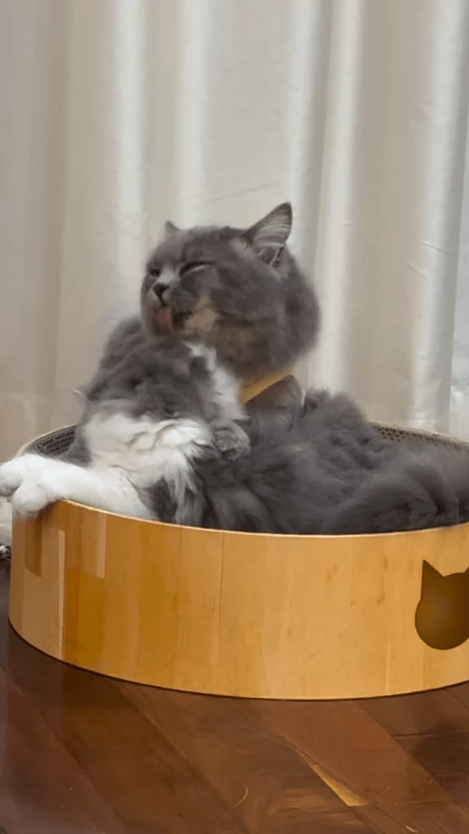 さらにその次の投稿では、丸い爪研ぎボックスの中でもつれこんでいるミルリィがラヴィの上からのしかかってペロペロと舐めながら毛繕いしている動画を投稿しています。ミルリィに対してラヴィは「負けるもんか」という感じで、前脚を突っ張ったり後脚で “猫キック” をお見舞いしたり、プロレスごっこのように元気に取っ組み合っています。