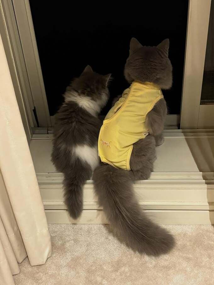 その次の投稿では「やっと落ち着いたね♡」「今度こそおやすみニャさい」と声を掛ける高橋さん。窓から夜を眺める2頭の後ろ姿は、すでに仲良しの雰囲気に満ちています。