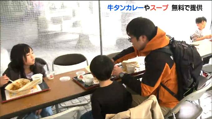 宮城の特産品を使ったメニューを提供する子ども食堂が3日、仙台駅西口に設けられ甘口の牛タンカレーやスープが無料で振る舞われました。