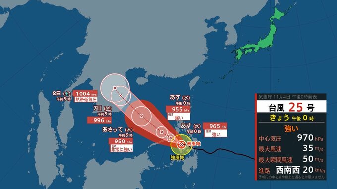台風25号は、きょう(4日)正午には強い勢力でフィリピンにあって、1時間に30キロの速さで西に進んでいます。中心気圧は970ヘクトパスカル、中心付近の最大風速は35メートル、最大瞬間風速は50メートルとなっています。