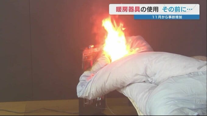 電気ストーブを使った実験映像では・・・寝返りでストーブと布団が接触して、あっという間に炎が上がりました。