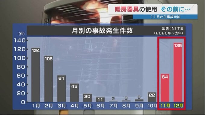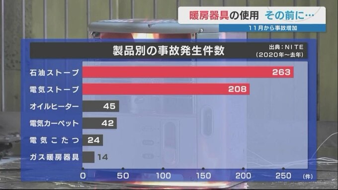 NITE(製品評価技術基盤機構)によりますと、過去5年間に全国で起きた主な暖房器具の事故は596件で、このうち約8割が電気ストーブや石油ストーブによるものでした。
