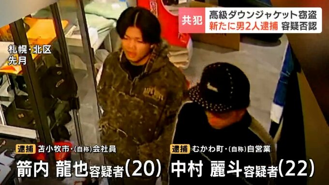 10月、札幌市北区のセレクトショップで高級ダウンジャケット5着が盗まれた事件で、警察は新たに男2人を逮捕しました。窃盗の疑いで逮捕されたのは苫小牧市の自称会社員・箭内龍也容疑者(20)と、むかわ町の自称自…