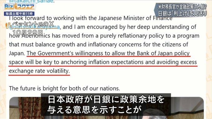 さらにベッセント氏も29日、SNSに<日本政府が日銀に政策余地を与える意思を示すことが為替レートの過度な変動を回避するカギになるだろう>と投稿した。