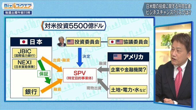 「アメリカの投資委員会が選定して、JBIC(国際協力銀行)などが出資・融資をする形だが、SPV(特定目的事業体)は決して日本企業だけに限定されないところがポイント。みんな日本企業がアメリカに投資をする案件ばかりイメージするが、そうじゃなくて、アメリカ企業、場合によっては第三国企業がアメリカに投資する。そこにJBICが融資をするのも80兆円の対象になる。JBICが他国の企業に融資をする理由は、日本企業から機器などを買うという条件がきちんとあるから」