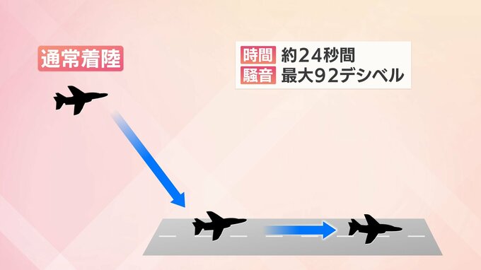 まず、「通常着陸」では、徐々に高度を下げて着陸します。着陸までの時間はおよそ24秒間、騒音は最大92デシベルとなっています。