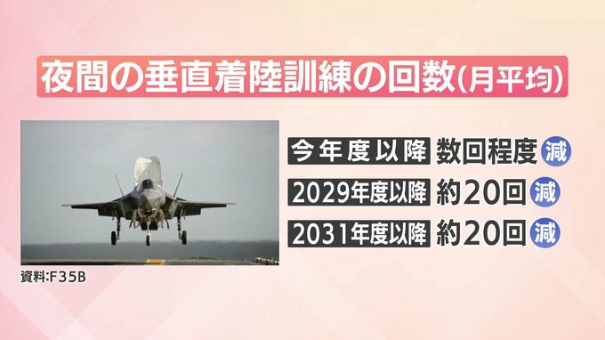 一方、こうした激しい騒音に対し、防衛省は負担軽減策を示し、夜間の垂直着陸訓練を減らすとしていて、2029年度以降は40回程度実施するとしていましたが、20回程度まで減少されるということです。