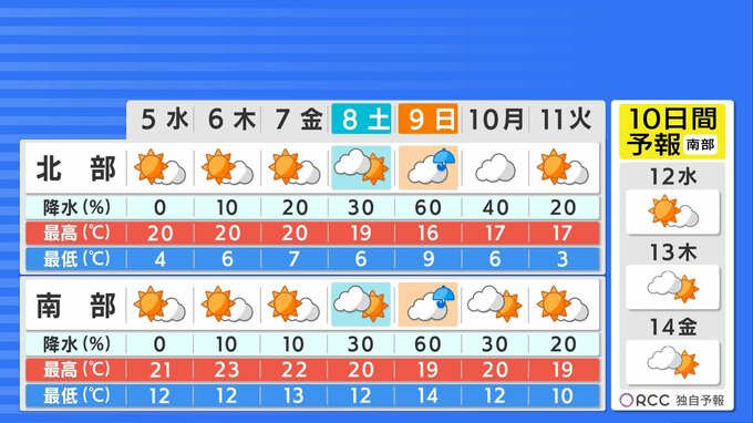 土曜日にかけておおむね晴れるでしょう。日曜日は雨が降る見込みです。あす以降は上空にこの時期としては暖かい空気が入り、気温は平年より高い傾向が続くでしょう。日ごとの寒暖差・一日の寒暖差ともに大きいですので、体調管理にはご注意ください。