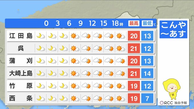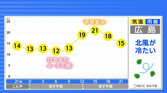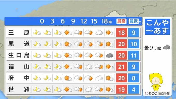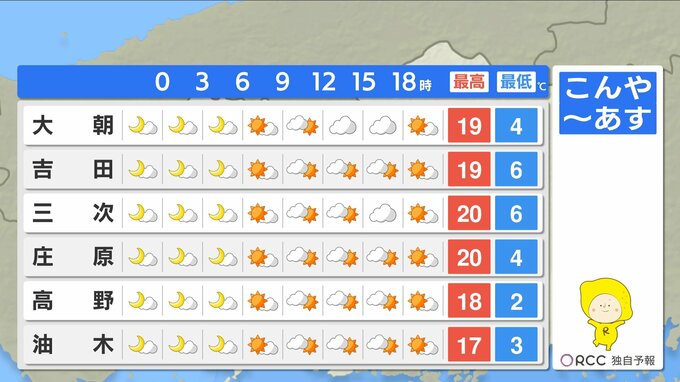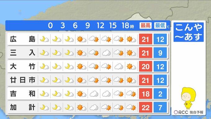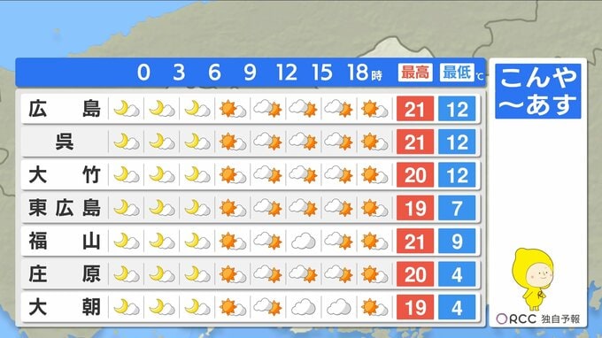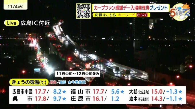 きょう4日(火)の広島県内は、午前中はよく晴れましたが、午後はだんだんと雲が多くなりました。そして朝は各地で冷え込みが強まり、大朝・高野・油木では氷点下の冷え込みとなりました。広島市中区の最低気温は8.2℃ 各地で11月中旬から下旬並みの気温になり、昼間も風がひんやり冷たい一日でした。