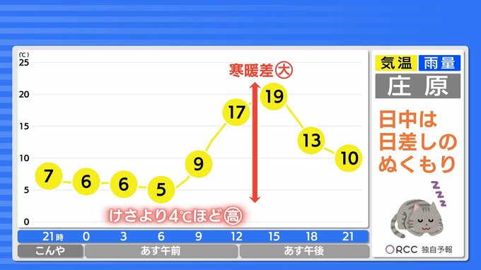 あすの朝はけさと比べると2℃~5℃ほど高くなり、冷え込みは緩むでしょう。それでも1ケタの地点が多い見込みですので、今晩も暖かくしてお休みください。昼間は20℃を超える地点が多く、日差しの暖かさを感じられるでしょう。北部や内陸部を中心に一日の寒暖差が大きいですのでご注意ください。