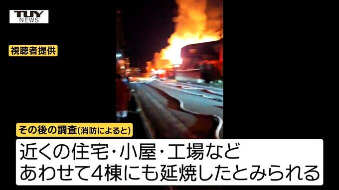また、その後の調査で、近くの住宅や小屋、そして工場などあわせて4棟も一部外壁が焼けるなどしたとみられるということです。この火災によるけが人はいないということです。