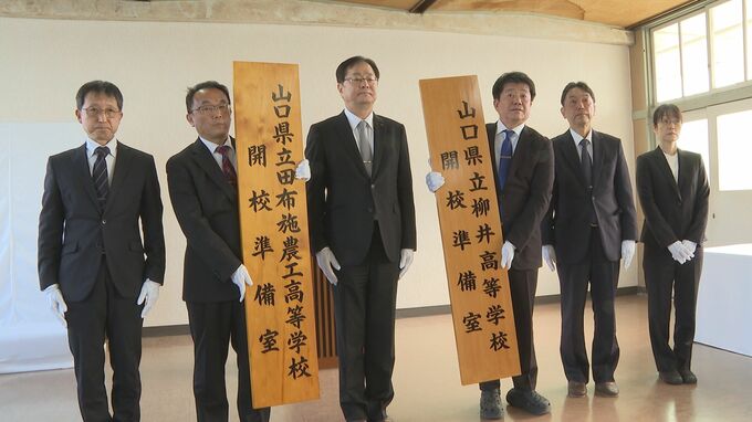 設置式では、県教育委員会の繁吉健志教育長から、柳井・田布施農工両校の校長に開校準備室の看板が渡されました。