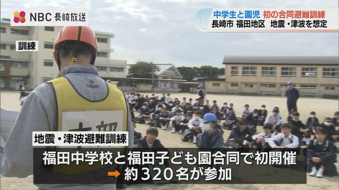 大きな地震が発生した場合津波による被害が想定される長崎市の福田地区で4日に初めて行われたのが、福田中学校と福田子ども園合同の地震・津波避難訓練です。あわせておよそ320人が参加しました。