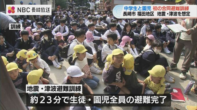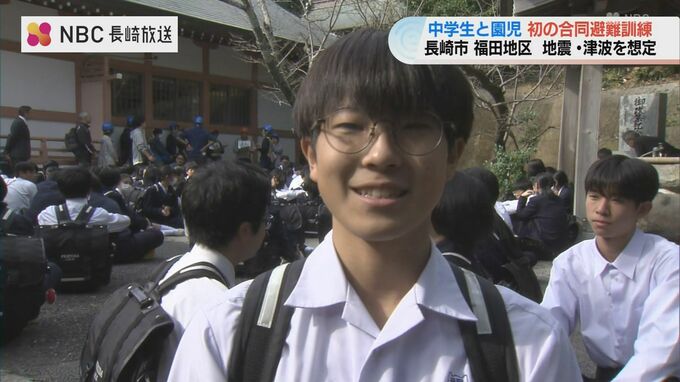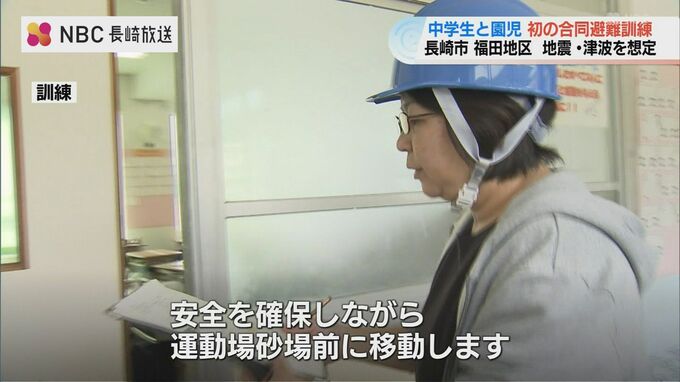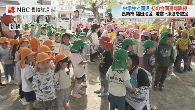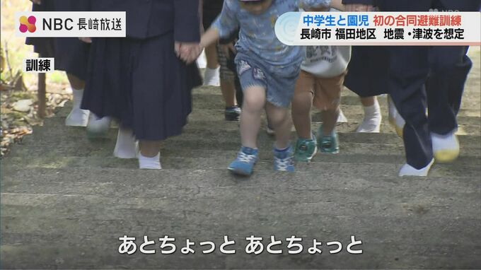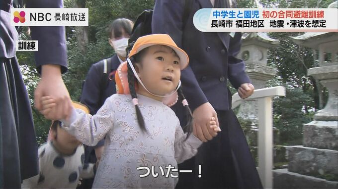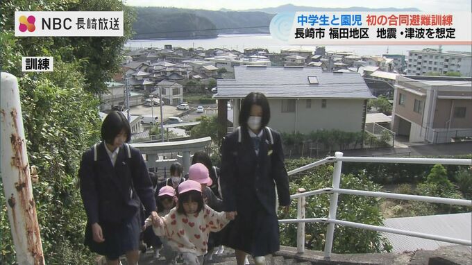 大きな地震が発生した場合に津波による被害が想定される長崎市の福田地区で、地元の中学生と子ども園の園児が一緒に地区の高台に避難する訓練を初めて実施しました。